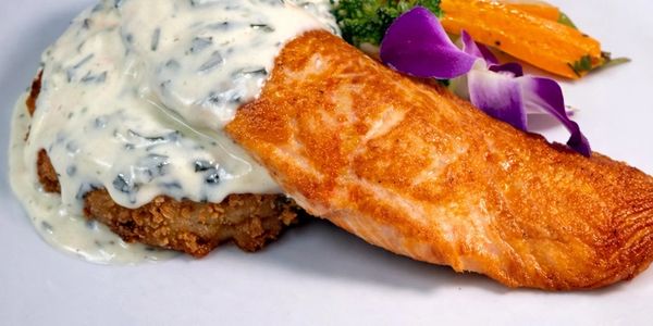 Grilled Scottish salmon served with a white spinach cream sauce, mushroom and gruyere risotto cake and carrots and brocolli. GF