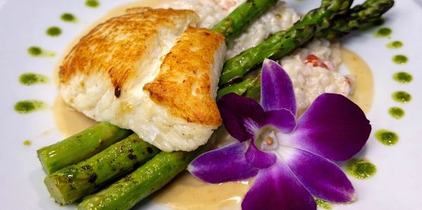 Jumbo shrimp, Florida Keys pink shrimp, and jumbo sea scallops in tomato-basil cream around lobster risotto with asparagus and fresh herbs. GF