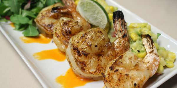 Barbeque spiced Key West shrimp grilled and served with corn relish and chipotle vinaigrette.