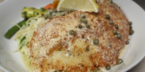 Swordfish loin pillared lightly coated in Panko breadcrumbs with lemon caper butter, mixed vegetables and garlic lump crab angel hair pasta